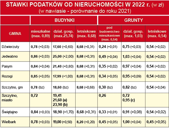 Najtaniej, w przypadku podatku od nieruchomości jest w Dźwierzutach i o dziwo w stolicy powiatu - Szczytnie, najdrożej w Jedwabnie. W tej ostatniej gminie niektóre stawki są ponad lub blisko dwukrotnie wyższe.