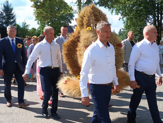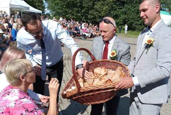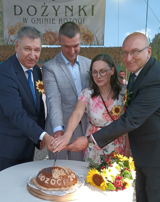 Następnie starostowie dożynek – Małgorzata Kamińska – Bałdyga i Piotr Kręciewski przekazali okazały bochen chleba gospodarzom święta – staroście Jarosławowi Matłachowi oraz wójtowi gminy Rozogi Zbigniewowi Kudrzyckiemu. Obaj włodarze w swoich wystąpieniach dziękowali rolnikom za ich ciężką pracę. Wójt zwracał uwagę, że jej efekty są uzależnione nie tylko od coraz bardziej odczuwalnych zmian klimatycznych, ale i niepewnej sytuacji gospodarczej, z powodu której gospodarze nie mogą liczyć na stabilne ceny.