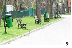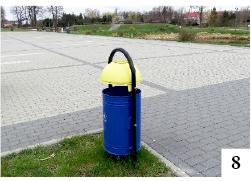 Emocje w stolicy naszego powiatu wywołują niekiedy sprawy niekoniecznie takich emocji godne. W poprzednim roku sporo osób żyło sprawą wędrującego lodowego rożka, niedawną ciekawostką była kradzież styropianowych jaj wielkanocnych, a sprawa najświeższa to krążący mms pokazujący zdjęcie z pewnym niezbyt trzeźwym mężczyzną, który załatwia swoją potrzebę fizjologiczną, siedząc na koszu na śmieci – i to w samym centrum Szczytna. Zgłaszamy zatem postulat, by przyjrzeć się dokładniej kwestii ulicznych pojemników. W Szczytnie są one generalnie otwarte, bez żadnych zamknięć czy daszków, co ułatwia takie nieobyczajne zachowania. Niekiedy swoje dodają kawki, które szukając resztek pożywienia, rozrzucają bez skrupułów śmieci – i powstaje po prostu nieład. Przyjrzeliśmy się niedawno temu, jak do śmieciowego problemu podchodzą w innych miejscowościach powiatu. Przechadzając się parkiem w Wielbarku, dostrzegliśmy, że kosze mają tu swego rodzaju zadaszenie, które utrudnia ingerencję w zawartość pojemnika (fot. 8) . Podobnie jest w Rozogach. Może nie wszystkie kosze stoją tu prosto (fot. 9) , ale wyjąć z nich coś (albo wprowadzić czymś innym niż ręką) jest już trudno.