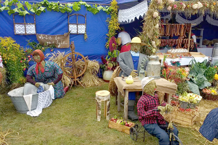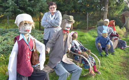 Figury, gdy dobrze się im przypatrzyliśmy, wydały się nam skądś znajome, zwłaszcza te słomiane (drugoplanowe na poprzednim zdjęciu). No tak, przecież zdobiły one stoisko Płozów m. in. na dożynkach powiatowych w Pasymiu. Jak wyjaśnia nam Magdalena Głowacka, były one wykonane właśnie w tym celu, no i cieszy się, że Płozy zdobyły tam I miejsce, właśnie za stoisko. Trud ich wykonania nie poszedł na marne. Teraz, gdy figury spełniły swoje zadania postanowiono, aby zdobiły wieś.