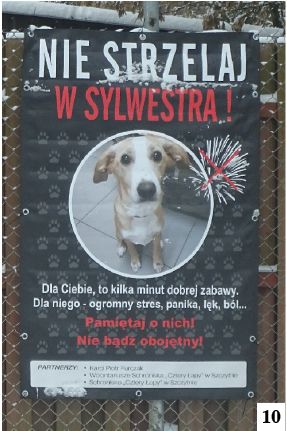 Za nami już prawie dwa tygodnie roku 2023. W sklepach przecenione niby-szampany wciąż stoją na półkach, ale poznikały z nich fajerwerki. Te drugie są od pewnego już czasu obiektem krytyki ze strony obrońców zwierząt. Argumenty oczywiście są słuszne, można by się jednak zastanowić nad ich siłą przebicia. W miniony tydzień widzieliśmy przypadkiem i poniewczasie plakat nawołujący do zrezygnowania z hałaśliwych sylwestrowych przyjemności (fot.10) . Znajdował się on tuż przy wejściu do szczycieńskiego schroniska dla zwierząt przy ul. Łomżyńskiej. Przypuszczamy, że w Szczytnie byłoby w sylwestra odrobinę ciszej i bezpieczniej dla czworonożnych pupili, gdyby podobne afisze znalazły się w najbardziej uczęszczanych rejonach miasta – wtedy zadziałałyby na większą grupę osób.