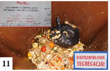 Przez długie lata w Polsce nie obowiązywała zasada segregacji śmieci. Podejście do tej kwestii zmieniło się w bieżącym stuleciu. W Szczytnie różnokolorowe pojemniki stoją od paru ładnych lat i teoretycznie powinniśmy zmienić już swoje myślenie. Niestety, jest z tym problem. Świadczy o tym fakt, że na kontenerach w różnych punktach miasta nalepiane są przez firmę zajmującą się odbiorem odpadów karteczki NIEPRAWIDŁOWA SEGREGACJA. Na klatkach schodowych tego czy owego bloku pojawiają się karteczki z tekstem sugerującym, że nieodpowiednie segregowanie może skutkować drastycznym podniesieniem opłat za wywóz odpadów. Pomyłki związane z odruchowym wrzuceniem czegoś do nieodpowiedniego pojemnika zdarzyć się, rzecz jasna, mogą. Niestety, nie brak osób, które papier lub odpady bio muszą bezrefleksyjnie wyrzucać razem z foliowym opakowaniem (fot. 11 ).
