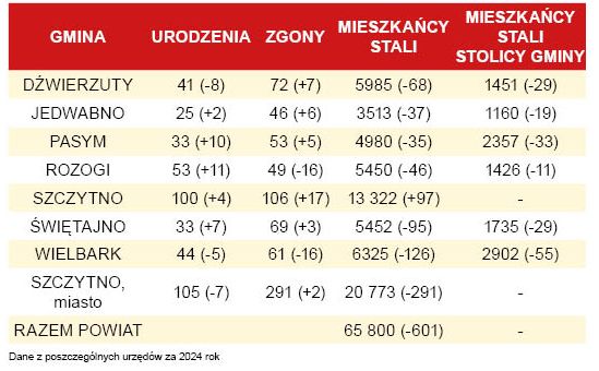 Z roku na rok liczba mieszkańców powiatu szczycieńskiego zmniejsza się w coraz większym tempie. Na koniec 2024 roku było nas 65 800, to o 600 mniej niż rok wcześniej i o 1100 mniej niż w roku 2022. Najbardziej demografia dała się we znaki w gminie Wielbark, gdzie ubyło aż 2% mieszkańców, dwukrotnie więcej niż średnio w całym powiecie. Stolica powiatu zmniejszyła się o blisko 300 mieszkańców i jeśli ta tendencja się utrzyma, za trzy lata Szczytno straci status miasta dwudziestotysięcznego. {akeebasubs !*}