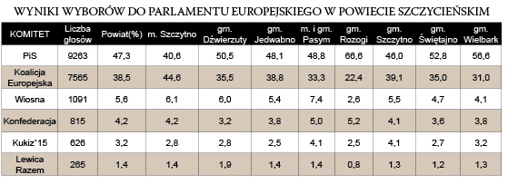 Mandaty z okręgu olsztyńskiego, w skład którego wchodzi powiat szczycieński, uzyskało dwoje przedstawicieli PiS-u: Karol Karski – 184 054 głosów i Krzysztof Jurgiel – 104 592 oraz Tomasz Frankowski z Koalicji Europejskiej – 125 845. Sztuka ta nie udała się Urszuli Pasławskiej, która uzyskała poparcie od 63 274 wyborców. Gdyby o zdobyciu mandatów decydowali tylko mieszkańcy powiatu szczycieńskiego, byłaby wśród zwycięzców. Otrzymała tu najwięcej, bo 4622 głosy. Dopiero za nią byli Karski – 4270 i Jurgiel – 2520.