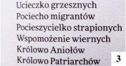 Nie wszyscy wiedzą, że tekst litanii w ostatnim czasie się zmienił – bliżej początku wprowadzono wezwania „Matko nadziei” i „Matko miłosierdzia”, bliżej końca – „Pociecho migrantów” (fot. 3) . Zostały one dodane w czerwcu ubiegłego roku przez papieża Franciszka, a dwa miesiące później tłumaczenie na nasz język zatwierdziła Konferencja Episkopatu Polski. Jeszcze pod koniec XX wieku, za pontyfikatu Jana Pawła II, dodano zawołanie „Królowo rodzin” - tych i innych nieco wcześniejszych zmian może nie być w starszych książeczkach do nabożeństwa, z których pewnie korzysta jeszcze część osób spotykających się na majowych modlitwach pod chmurką.