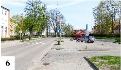 Pomysł wart rozważenia, ale jakoś powątpiewamy w jego realizację. Kawałek dalej jest zakręt o dość dziwnym profilu (przy samej krawędzi jezdni stoi kolejny inteligentnie umieszczony słup), co utrudniłoby sprawę. Jadącym ul. Chrobrego i widzącym sznur samochodów pozostaje przewidzieć sytuację, zawrócić na nieodległym parkingu (fot. 6) i pojechać którąś z równoległych ulic. Analogiczne problemy mają np. jadący ul. Warszawską i zamierzający skręcić przed przejazdem.
