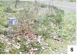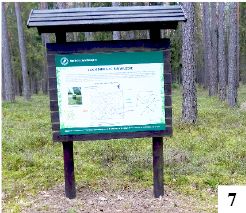 W lesie można nocować, można w nim się zgubić. Stary sprawdzony sposób rozwiązania problemu to szukanie mchu na drzewach – koniecznie od strony północnej. Bywa jednak i tak, że mech porasta pień dookoła i ten sposób odpada. W wypadku zagubienia się w lesie punktem odniesienia może być słońce, ale nie zawsze chce ono świecić. Brak telefonicznego zasięgu bywa w wielu miejscach normą – i co wtedy? Praktycznie w każdym sezonie podajemy informacje o głównie starszych osobach, które spędziły w takiej dezorientacji paręnaście godzin. Wynika to głównie z kręcenia się w kółko i zmieniania kierunku marszu. Najsensowniej iść w jedną stronę. Nasze lasy to nie syberyjska tajga czy puszcza amazońska i po góra dwóch godzinach powinniśmy zobaczyć ludzkie siedziby. Istnieje jeszcze prostszy sposób. Opisany on jest chociażby na tablicach umieszczonych na odwiedzonej przez nas niedawno ścieżce dydaktycznej w Lipniku (fot. 7). W lasach, najczęściej przy rozstajach dróg, spotkamy słupki z wymalowanymi liczbami. Nie jest to tylko tajny kod leśników (choć z oznakowania korzystają głównie oni), ale i pomoc dla tych, którzy w lesie się pogubili. Tereny leśne podzielone są na oddziały. Mają one zazwyczaj kształt prostokąta. Słupki są ustawiane w południowo-zachodnim narożniku oddziału. Na każdym boku znajdują się cztery różne liczby – dwie mniejsze (ale następujące kolejno po sobie) od strony północnej, dwie większe – od południowej. Oddziały numeruje się od wschodu w stronę zachodu, zaczynając od północno-wschodniej części lasu. Na mapie linie oddziałowe tworzą siatkę przebiegającą zgodnie z układem południkowo-równoleżnikowym lub nieco przesuniętą w kierunku zachodnim. Tak czy owak kierunek mniej więcej północny wyznaczy nam krawędź między częściami słupka zawierającymi mniejsze liczby. Na fot. 8 nie widzimy liczb 227 i 236. Jeśli chcemy iść na północ, na pewno nie wybierzemy kierunków wyznaczanych przez 236 i 237. Takie słupki znajdują się co kilkaset metrów, a w pewnym momencie się kończą – po prostu wychodzimy z lasu.