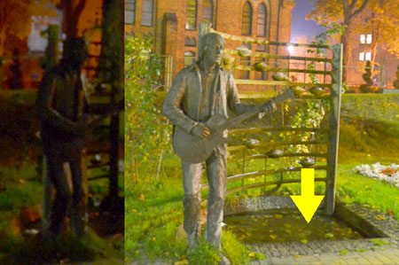 Zawsze jest tak, że po dniu przychodzi noc i wtedy to, co nie zostało oświetlone, tonie w ciemnościach. No i już wieczorami, choć pasaż jest dobrze iluminowany, postać Klenczona ginie, niestety, w mroku (na zdjęciu prawa strona została sztucznie rozświetlona poprzez długą ekspozycję – rzeczywistość oddaje lewa strona).
