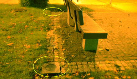 Są to specjalne punkty świetlne. Reflektorki oświetlające pomnik znajdują się pod wodą w miejscu oznaczonym żółtą strzałką. Podobnie jest w przypadku ławeczek – po obu ich stronach (żółte otoki) zainstalowano iluminatory, które zostały zagłębione w ziemi. Opisane źródła świtała jednak nie działają. Jak mówią nam wieczorowi spacerowicze, reflektorki tego lata w ogóle nie świeciły. Dawniej i owszem, więc albo nastąpiła awaria, albo miasto oszczędza na prądzie.