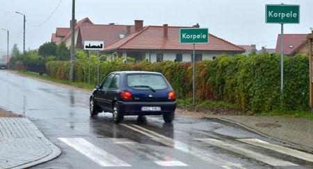 Oto za skrzyżowaniem ul. Gnieźnieńskiej z Osiedleńczą odchodzi jeszcze trzeci trakt bez nazwy, bo stanowi go droga gminna. Jest to już terytorium miejscowości Korpele, a co ciekawe oznajmiają to aż dwie tabliczki stojące jedna za drugą w niewielkiej zresztą odległości. Nasz Czytelnik żartuje, że Korpele pozazdrościły nazwy miemieckiemu uzdrowisku Baden-Baden i chcą być równie sławne.