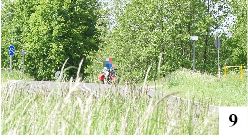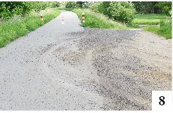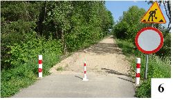 W ostatnim czasie pobocze w zasadzie znikło, a wybujała roślinność zwęża także samą ścieżkę (fot. 7) i powoli niszczy jej krawędzie. Pewien dyskomfort można odczuwać także tuż za stacyjką w Ochódnie – ktoś z rozpędem zahacza tu, wyjeżdżając z drogi gruntowej, i przy okazji rozsiewa na ścieżce kamyki (fot. 8) . A może przydałyby się jakieś barierki? Tego typu nie na każdego jednak działają. Tuż przy przecięciu ścieżki dla rowerzystów z drogą krajową nr 58 w pobliżu Zielonki ustawiono już na początku znak nakazujący zejście na chwilę z roweru, w ubiegłym roku dostawiono barierki mające uniemożliwić przejeżdżanie przez drogę. Wiele osób nic z tego sobie jednak nie robi i znaleziono już obustronne luki, by bez zsiadania z dwuśladu przez ruchliwą drogę sobie przejechać (fot. 9).