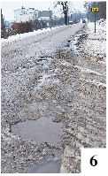 Trwająca wciąż – co najmniej w kalendarzu – zima wyjątkowo negatywnie wpływa na stan wielu dróg. Wahania temperatury łączą się z nie zawsze najlepszą jakością nawierzchni i efekt mamy taki jak np. na ul. Mrongowiusza, czyli początku drogi wojewódzkiej prowadzącej do Mrągowa. Blisko krawędzi jezdni dziura na dziurze i dalej też dziura (fot. 6). Niekoniecznie lepiej wyglądają także niektóre odcinki dróg wyższej kategorii, bo krajowych. Dwadzieścia lat temu pachniał nowością fragment DK 58 między Korpelami i Dzierzkami. Teraz trasa ta wygląda jak przed ówczesnym remontem, czyli kiepsko. Pewne obawy budzi stan niedokończonej jeszcze formalnie ul. Bohaterów Westerplatte. Jej remont rozpoczął się niekoniecznie w dobrym momencie. Drogowców zaskoczył pierwszy, czyli listopadowy atak zimy i wkrótce roboty stanęły, choć termin zakończenia prac teoretycznie minął. Asfalt wokół niektórych studzienek kanalizacyjnych jest popękany (fot. 7).