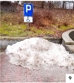 Na początku tygodnia zrobiło się niemal wiosennie, nie zapominajmy jednak, że zima niekoniecznie powiedziała ostatnie słowo. W wielu miejscach pogoda poprawiła stan chodników i przejść dla pieszych. Przypominamy, że odśnieżaniem i odladzaniem chodników przylegających do posesji powinien zajmować się właściciel. Jeśli pomiędzy chodnikiem a budynkiem znajduje się pas zieleni, obowiązek spływa na gminę. Odnosimy przykre wrażenie, że w ostatnich tygodniach ktoś zapomniał o swoich obowiązkach, a winne były częstokroć obie strony. Współczuliśmy przede wszystkim starszym osobom, dla których przejście oblodzonym chodnikiem albo wejście na zalane częściowo pasy stanowiło nie lada wyzwanie. Podobne zaniedbania są, niestety, także w innych miejscowościach, co jest marnym pocieszeniem. Dość ciekawy widok utrwalił na zdjęciu jeden z naszych mieszkańców odwiedzających ostatnio Gietrzwałd. Gdzie najlepiej zgarnąć cały śnieg z parkingu? Oczywiście na miejsce przeznaczone dla osób niepełnosprawnych (fot 9.).
