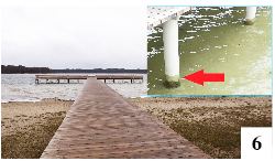 Gdy parę tygodni temu odwiedziliśmy Warchały, zastaliśmy widok podobny do tego sprzed roku – nieuprzątnięty na ostatnim odcinku ciąg pieszo-rowerowy. Ktoś powie, że sezonu jeszcze nie ma, ale przecież pobliski hotel przez cały rok odwiedzają goście. Na pewno niektórzy z nich robią sobie spacery czy urządzają przejażdżki i odpowiednie obrazki zapamiętują lub utrwalają w telefonach. W Warchałach i okolicach, o ile nie nawiedzi nas znowu pora sucha, pomniejszone zostaną plaże, które skądinąd kiedyś były jeszcze mniejsze, gdy woda sięgała wyżej. Teraz poziom jeziora Narty trochę się podniósł, co widać chociażby na podporach mola w Warchałach – część stempla pokryta farbą znajduje się poniżej lustra (fot. 6) . Turystów na plażę wejdzie teraz pewnie trochę mniej, ale woda będzie im sięgała wyżej.
