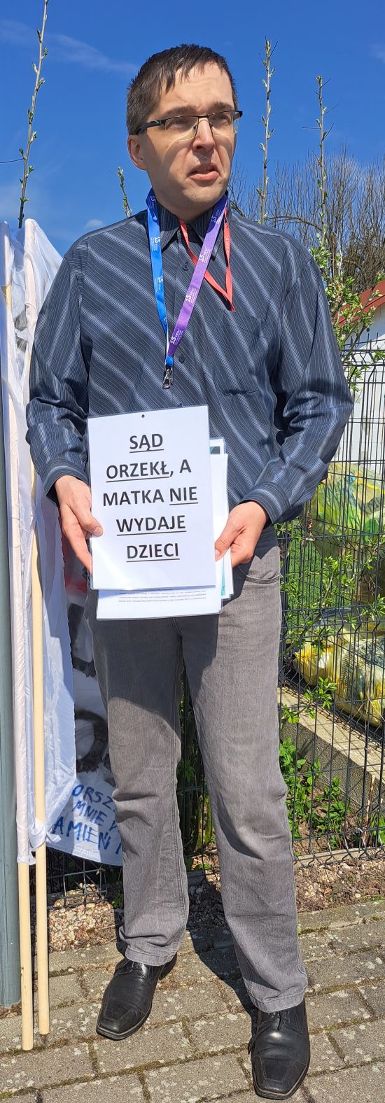 W niewielkiej miejscowości, jaką jest Jedwabno, widok mężczyzny z charakterystycznym transparentem w bliskim sąsiedztwie kościoła, budzi ciekawość i liczne komentarze. Jednak Piotr Wichowski, ojciec trojga dzieci w wieku 13, 5 i 4 lat, zdaje się tym nie przejmować. Od dwóch miesięcy protestuje pod domem teściów, gdzie obecnie mieszka jego żona wraz z dwoma córkami i synem. Na transparencie wykonanym przez mężczyznę widnieje napis: Tu mieszkają złodzieje 3 dzieci, ulubieńcy proboszcza oraz cytat z Biblii: A kto by zgorszył jednego z tych małych, którzy we mnie wierzą, lepiej mu, aby zawieszono kamień u szyi i zatopiono. Piotr Wichowski ma przy sobie także zdjęcia z dziećmi oraz kartkę informującą, że jego żona nie wykonuje decyzji sądu umożliwiającej mu kontakty z nimi.