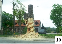 Przymierzaliśmy się ostatnio do napisania o obumarłym drzewie rosnącym na ul. Chrobrego w Szczytnie, niedaleko ronda. Parę miesięcy temu robiliśmy mu zdjęcie – wyrosły na nim jadalne zimówki aksamitnotrzonowe. W tym roku drzewo nie wydało już liści, straciło ponadto niemal w całości korę i wyglądało z tego powodu osobliwie. Osobliwie i groźnie, ponieważ było lekko przechylone w stronę ulicy i mocniejszy wiatr mógłby doprowadzić do nieszczęścia. W minioną sobotę zostało ścięte (fot.9). I chyba dobrze się stało, choć w przypadku ciekawszych okazów zdarzają się innego typu inicjatywy. W Węgorzewie podjęto sporo starań, by w jakiś sposób pozostawić ślad po rosnącej niedaleko dworca autobusowego topoli. Drzewo to rosło dłużej niż przeciętny przedstawiciel tego gatunku, ale obumarło. Ostatecznie powstał z niego specyficzny pomnik (fot.10).{/akeebasubs}