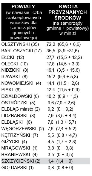 W ostatnim rozdaniu środków z Rządowego Funduszu Dróg Samorządowych na województwo warmińsko-mazurskie przypadło ponad 280 mln zł. Rozrzut w dofinansowaniu inwestycji drogowych w poszczególnych powiatach jest ogromny. Szczycieński, podobnie jak poprzednim razem, znalazł się na szarym końcu.