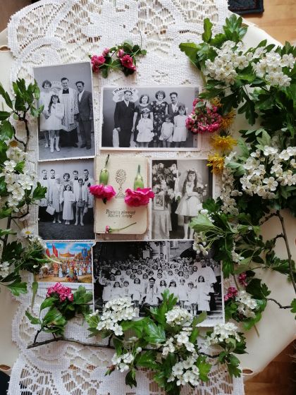 W tamtych czasach wierni zadawali sobie dużo trudu, by pięknie udekorować domowe okna, a okna naszego mieszkania przy ulicy Konopnickiej 68 tuż przed kościołem, moi rodzice przemieniali w unikatowy ołtarzyk. Mój ojciec przywoził dwie brzózki, które swoim sposobem przymocowywał do okiennej futryny. Mama zrywała z ogrodu piwonie oraz inne kwiaty i stawiała je w wazonach na parapecie. Okno obowiązkowo zasłonięte było białym płótnem, do którego szpileczkami pracowicie przypięte były kwiaty głogu, a pośród tej kwietnej kaskady królował obraz z wizerunkiem Jezusa Chrystusa klęczącego w Ogrójcu. Wystrój budził podziw, ale i też pożądanie, bowiem ci wszyscy, którym nie udało się zerwać gałązek brzozowych z czterech stacji, w tej piątej, nieoficjalnej, ale poświęconej przez księdza Batowskiego w te gałązki się zaopatrywali. Mimo że wielkie spustoszenie powstawało na naszym oknie, to rodzice co roku zadawali sobie dużo trudu, aby je udekorować. Po procesji prawie wszyscy wracali do domów, niosąc w rękach gałązki brzozowe. Miały one niezwykłą moc. Zatykane za świętym obrazem zapewniały Bożą opiekę i chroniły przed złymi duchami. Umieszczane w ziemi na polu lub w ogrodach gwarantowały urodzaj. Ja sama już jako dorosła osoba z procesji przynosiłam i w ziemię na działce wtykałam taką brzozową, pochodzącą z ołtarza Bożego Ciała gałązkę. Mimo że na przestrzeni lat uczestniczyłam w wielu procesjach wiodących bocznymi i głównymi ulicami, to najbardziej pamiętam tę, gdy w białej sukience ulicami Szczytna wędrowałam i kwiatami sypałam.