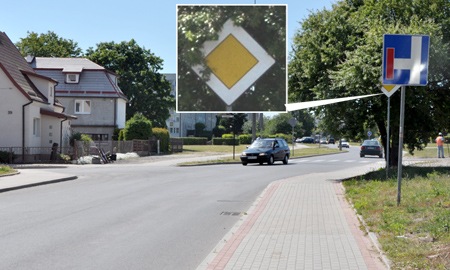 Na załączonym zdjęciu po lewej stronie widać znaki drogowe w pozycji raczej spoczynkowej. Usunięto je, bo były już niepotrzebne, gdy inwestycję zakończono i ulica stała się całkowicie przejezdna, bez żadnych ograniczeń. Ale czy na pewno? Oto gdy jedziemy ul. Solidarności od strony WSPol i chcielibyśmy wjechać właśnie w ul. Pułaskiego, napotykamy ma znak niespodziankę informujący, że ta jest ślepym traktem. Ów znak, który co gorsza zasłania inny ważny – droga z pierwszeństwem przejazdu, należy czym prędzej usunąć.