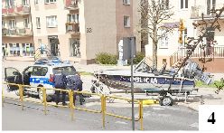 Wypadki chodzą po ludziach, nie po górach. Po przedstawicielach stróżów prawa także, choć do tych drogowych nie powinno z oczywistych powodów z ich winy dochodzić. Mocno nietypowo wyglądało wydarzenie, do którego doszło w miniony czwartek prawie w centrum Szczytna. Osoby znajdujące się w pobliżu głównej miejskiej poczty usłyszały najpierw głośny huk, przypominający odgłos upadku jakiegoś dużego i ciężkiego elementu, a potem zobaczyły obrazek widoczny na fot. 4 Odpięła się przyczepka ze służbową motorówką, skasowany został znak przy przejściu dla pieszych i zrobiło się na pewien czas zamieszanie połączone z zablokowaniem przejazdu ulicą. No i zrobieniem czegoś z przyczepką, z której koła uciekło powietrze. Na szczęście nikomu nic się nie stało. A gdyby było inaczej i motorówka stróżów prawa uciekła w stronę pieszych? Albo na zakręcie zderzyła się z samochodem? Wszystko w przededniu oficerskiej promocji w WSPol… Dzień po promocji na tyłach uczelni dostrzegliśmy dość dziwnie zaparkowane samochody, prawdopodobnie kursantów z różnych województw. Co pewien czas zwracają nam na to uwagę przechadzający się tamtędy mieszkańcy Szczytna. Auta wjeżdżają na trawnik znajdujący się tuż za krawężnikiem, a nawet zatrzymują się na wjeździe na parking (fot. 5). Takie naginanie przepisów co najmniej niektórym chyba nie przystoi.