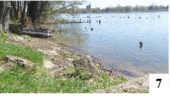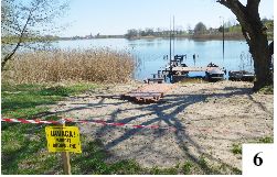 Jeśli przespacerujemy (lub przejedziemy się) nadjeziorną ścieżką w kierunku Bartnej Strony, zobaczymy po pokonaniu mniej więcej kilometra wystające z wody liczne pale, których stan nie pozwala ich kojarzyć z jakąś rozpoczętą budową. Pale stoją tam (choć z pewnością zmieniane) od dziesięcioleci, w miejscu, w którym znajdował się jeszcze przedwojenny ośrodek wodny. Nasi czytelnicy zwracają uwagę, że zrobiło ich się jakby więcej. To efekt obniżającego się poziomu jeziornych wód i odsłonięcia słabiej widocznych wcześniej wierzchołków (fot. 7).