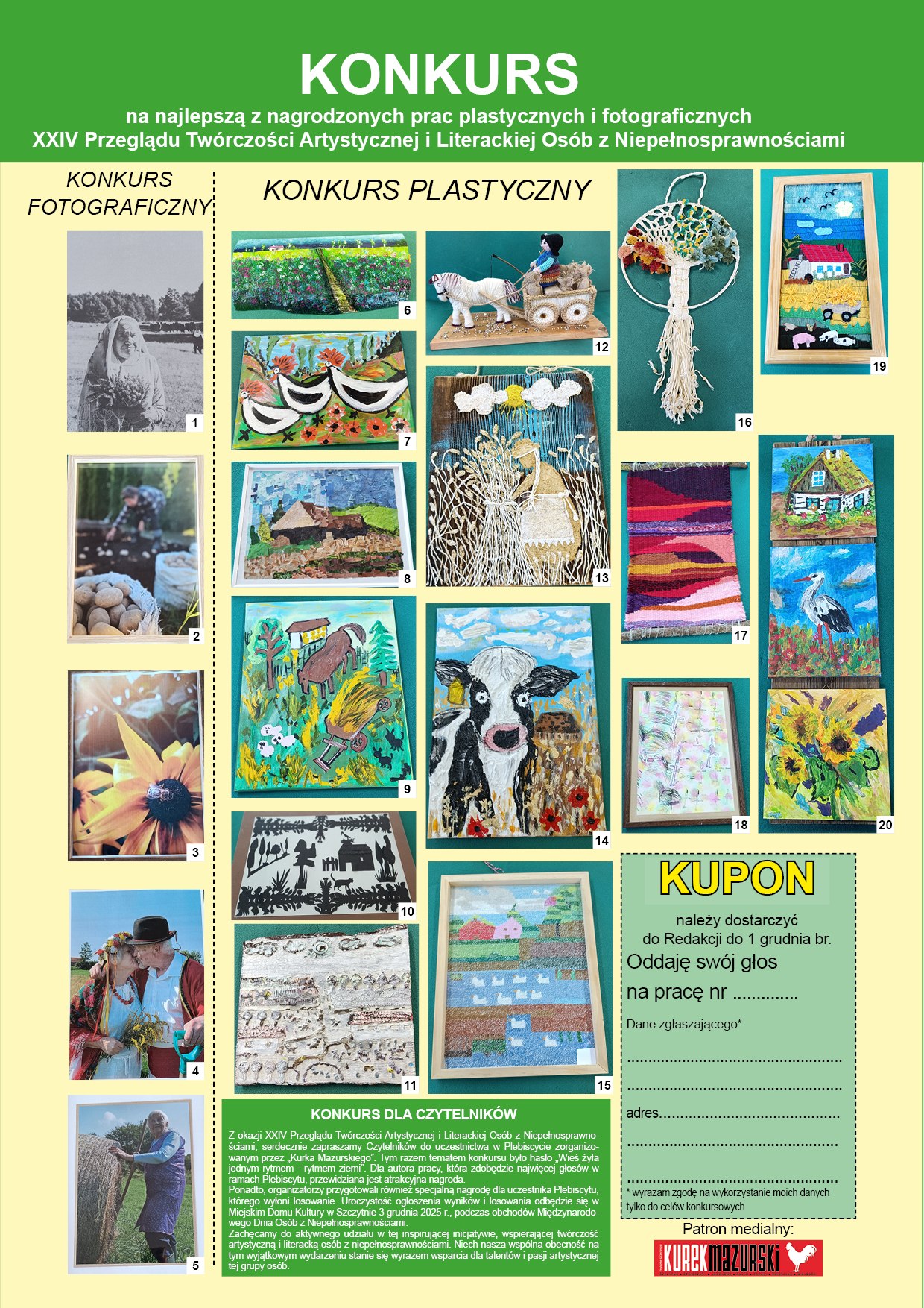 Jak co roku, organizator przeglądu, Stowarzyszenie Pomocy na Rzecz Osób z Niepełnosprawnościami, wraz z redakcją „Kurka Mazurskiego”, ogłasza konkurs dla czytelników na najlepszą ich zdaniem pracę plastyczną lub fotograficzną. Głosowanie odbywa się za pomocą kuponów, które drukujemy obok wyróżnionych prac na stronie 31.
