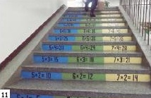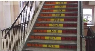 Nie wolno przechodzić w niedozwolonych miejscach, jak najbardziej dozwolone jest natomiast wchodzenie i schodzenie (ale nie zbieganie) po schodach. Poprawia to naszą kondycję i podobnie jak w szczycieńskim Gimnazjum nr 2… pozwala utrwalić tabliczkę mnożenia. (fot. 10). Na pomysł, by w ten edukacyjny sposób przyozdobić stopnie, wpadła dyrekcja. Szablony przygotowali uczniowie, wystarczyło tylko zakupić farbę, by całości dopełnili pracownicy obsługi. W szkole obowiązuje oczywiście zasada stopniowania trudności – im jesteśmy wyżej, tym większe czynniki (mnożna i mnożnik) się pojawiają. (fot. 11).