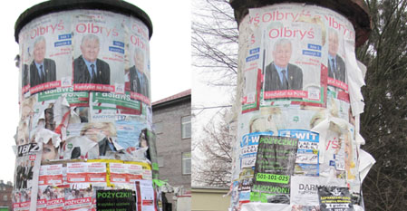 • W pierwszych dniach grudnia na ulicach Szczytna wciąż można było natrafić na powyborcze pozostałości w postaci plakatów z wizerunkami kandydatów do parlamentu. Termin ich usunięcia co prawda dawno minął, ale któż by się tym przejmował. Co ciekawe, wyjątkową jednomyślność w sprawie tego, kto powinien posprzątać, wykazali lokalni przedstawiciele przeciwnych obozów politycznych, Szczepan Olbryś (PiS) i starosta Jarosław Matłach (PSL). Otóż obaj uznali, że usunięcie plakatów to zadanie … miasta.
