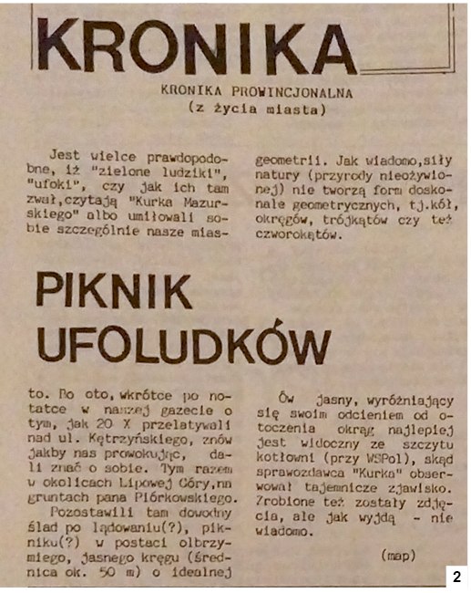Przyznamy się bez bicia, że nie policzyliśmy, ile odcinków „Kroniki” się ukazało. Początkowo wydawano ją nie w każdym numerze. Można było, niczym w np. telenoweli, bawić się w numerowanie, ale jakoś o tym nie pomyśleliśmy. Szacunkowo „Kronika” wyszła ponad 1500 razy. Gdyby przemnożyć to przez liczbę tekścików ukazujących się w danym odcinku, wyszłoby tych historyjek pewnie 7-8 tysięcy, o tytułach, którymi staraliśmy się przykuć w jakiś sposób uwagę (fot. 2) . Do przełomu października i listopada 2017 „Kronikę” prowadził nieodżałowany śp. Marek J. Plitt. Gdy bardzo poważnie zachorował, obowiązki po paru tygodniach przejął niżej podpisany. Miał on krótki epizod już paręnaście lat wcześniej, gdy Marek udał się na dłuższy urlop (dłuższy urlop w małej redakcji to rzecz naprawdę niełatwa, może nie każdy zdaje sobie z tego sprawę). Kilka odcinków „Kroniki” ma na swoim koncie także redakcyjna sekretarz Ewa Kułakowska. Kolejnych części nie będzie...
