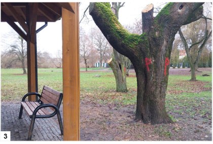 Smutki smutkami, wspomnienia wspomnieniami, ale wypada zakończyć wszystko na odpowiednim poziomie, czyli po prostu napisać coś zwyczajnego do „Kroniki”. A więc – do rzeczy. Na koniec trochę się powtórzymy (wcześniej czasem też to robiliśmy, przyznajemy) i dajemy dziennikarskie słowo, wrócimy po raz już naprawdę ostatni do tematu wycinek i przycinek. W Szczytnie i okolicy znakiem rozpoznawczym zapowiadanych (a niekiedy już przeprowadzonych prac) są różne symbole na drzewach. „X” oznacza dla drzewa koniec, „P” - tylko przycięcie tego i owego. Drzewo wtedy zostaje, ale wymalowana litera – również (fot. 3) . Jakoś nie widzimy potem prób wytarcia owego oznakowania, a przecież można by podejść do sprawy trochę subtelniej. Litery są przede wszystkim dość duże i trochę szpecą krajobraz. Gdy niedawno byliśmy w Ełku, widzieliśmy, że na drzewa przeznaczone do tego czy owego nałożono opaskę ze stosownym napisem (fot. 4) - i potem można to zdjąć. Chyba niegłupie i raczej budżetu nie rujnuje. To taka nasza ostatnia sugestia.