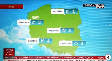 Ci, którzy oglądają prognozy pogody nadawane przez różne stacje, mogą regularnie przypominać sobie, gdzie leżą Suwałki, Warszawa, Wrocław czy Szczecin, a więc miasta obowiązkowo zaznaczane na meteorologicznych mapach. Jakiś czas temu alternatywne rozwiązanie zaproponowała bodaj Superstacja – tu w prognozie na mapie pokazywano na ogół wioski o dziwnych, często budzących uśmiech nazwach. Pomysł podchwycił Teleexpress Extra i w nim również od pewnego czasu trudno zobaczyć stolice województw lub inne ważne miasta. Często w prognozie pojawiają się miejscowości z nazwami kojarzącymi się z jakąś dziedziną, sferą, np. ciąg Krasna – Ładne – Ładna - Piękne Kąty. W minionym tygodniu telewidzowie z całego kraju dowiedzieli się, że następnego dnia w Leleszkach (gmina Pasym) będzie plus 1 (fot. 4). Co Leleszki łączy z innymi miejscowościami na mapie – trudno powiedzieć. W okolicach Szczytna nie brak wiosek o oryginalnych nazwach, niewykluczone zatem, że i którąś z nich zobaczymy jeszcze w ogólnopolskiej prognozie pogody.