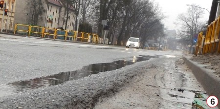 Formalnie od miesiąca trwają prace związane z budową ronda na skrzyżowaniu ulic Polskiej, Leyka, Wileńskiej i Piłsudskiego. Ta ostatnia, mająca jako patrona symbol odzyskania niepodległości, doczeka się gruntownej modernizacji akurat na 100-lecie przywrócenia Polsce wolności. Na razie w opisywanym rejonie widać jedynie efekty prac przygotowawczych. Osoby mieszkające lub pracujące przy ul. Piłsudskiego napotykają widok odmienny od tego, do którego były przyzwyczajone przez lata. Znikły praktycznie wszystkie drzewa i krzewy znajdujące się nie tylko w skrajni jezdni, ale i te, które rosły po drugiej stronie chodnika (fot.5). Pozostawiono jedynie rachityczne jeszcze drzewka posadzone niedawno. Częściowej wycinki doczekał się nawet drzewostan przy pobliskim kościele i przedszkolu. Przebudowa obejmie końcowy odcinek ul. Polskiej (mniej więcej od skrzyżowania z ul. Krzywą), przyległe do ronda fragmenty ulic Leyka i Wileńskiej, a zmodernizowaną trasą kierowcy pojadą w stronę Ostrołęki nieco ponad kilometr. Będzie okazja do poprawienia jakości podłoża i asfaltu, bo na razie nawierzchnia w paru miejscach wyraźnie deformowała się w wyniku nacisku cięższych pojazdów czekających na światłach (fot.6).