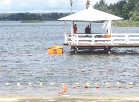 … ale tylko w znanej piosence Wałów Jagiellońskich. Pogoda podczas trwających już prawie dwa tygodnie wakacji jak na złość nie przypomina aury z maja i znacznej części czerwca. Od pierwszej niedzieli kanikuły oficjalnie czynna jest nieźle prezentująca się szczycieńska plaża, ale poza kilkoma dniami frekwencja tu była niewielka. Pieczę nad ewentualnymi miłośnikami kąpieli sprawują od 10 rano do 8 wieczorem ratownicy (fot. 7). Pracy na razie jednak zbyt dużo nie mieli. Milusińskich kuszą ustawione blisko brzegu zjeżdżalnie, lecz temperatura np. w miniony weekend niekoniecznie zachęcała do wejścia do naszego akwenu (fot. 8). Nieliczni turyści przechadzali się po plaży w strojach zgoła jesiennych.