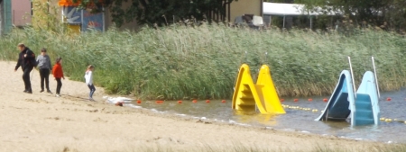 … ale tylko w znanej piosence Wałów Jagiellońskich. Pogoda podczas trwających już prawie dwa tygodnie wakacji jak na złość nie przypomina aury z maja i znacznej części czerwca. Od pierwszej niedzieli kanikuły oficjalnie czynna jest nieźle prezentująca się szczycieńska plaża, ale poza kilkoma dniami frekwencja tu była niewielka. Pieczę nad ewentualnymi miłośnikami kąpieli sprawują od 10 rano do 8 wieczorem ratownicy (fot. 7). Pracy na razie jednak zbyt dużo nie mieli. Milusińskich kuszą ustawione blisko brzegu zjeżdżalnie, lecz temperatura np. w miniony weekend niekoniecznie zachęcała do wejścia do naszego akwenu (fot. 8). Nieliczni turyści przechadzali się po plaży w strojach zgoła jesiennych.