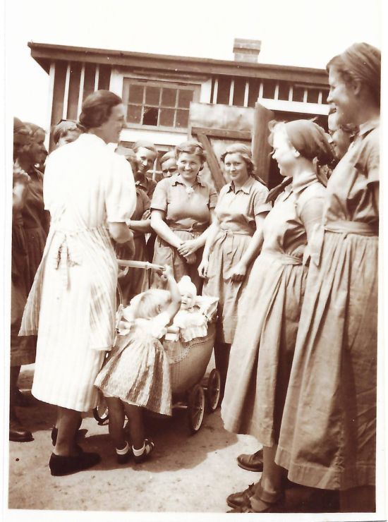 Na przełomie lat trzydziestych i czterdziestych w pałacu mieścił się żeński obóz Służby Pracy Rzeszy (RADwJ-Abteilung 17/11 Erben). Służące w nim dziewczyny nosiły proste niebieskie suknie, przystrojone białymi fartuszkami. Ze zdjęć wynika, że pracowały na roli i w ogrodzie, dwie zatrudniono w pobliskiej szkole. Były też one bez wątpienia w trakcie swojej służby indoktrynowane ideologią narodowosocjalistyczną. Na jednym ze zdjęć widzimy je gdzieś na terenie powiatu szczycieńskiego stojące przed starą, krytą strzechą, mazurską chałupą w towarzystwie szczycieńskiego starosty Wiktora von Posera, który zapewne opowiadał im coś w nazistowskim duchu o historii i specyfice regionu. W 1939 r. na czele obozu stała Hilde Schibert.