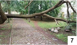 Na skwerze Klenczona, czyli terenie zielonym pomiędzy ul. Sienkiewicza i Jeziorem Domowym Małym, rośnie kilka drzew z charakterystycznym pniem – idącym raczej nie ku górze, a przechylającym się mocno w bok w ten sposób, że gałęzie stykają się z ziemią. Jeden z takich pni przechodził nad ścieżką w pobliżu pubu. Małe dzieci mogły pod nim przechodzić bez schylenia się, wyżsi musieli już kombinować, jeśli zamierzali tamtędy przejść. Całość ułatwiał swoisty stempel, który podtrzymywał drzewo. Przechodząc tamtędy w miniony weekend, dostrzegliśmy, że podpora leży na ziemi, a pień pochylił się jeszcze bardziej (fot. 7). Skoro całość znajduje się przy oficjalnej wybrukowanej ścieżce, przydałoby się chyba owo miejsce jakoś oznaczyć – albo w ogóle zakazać poruszania się tamtędy, by nie doszło do nieszczęścia.