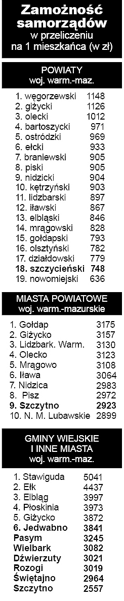 Powiat szczycieński znajduje się na szarym końcu w województwie pod względem osiąganych dochodów w przeliczeniu na 1 mieszkańca. Jego stolica plasuje się w środku stawki. W ścisłej czołówce jest natomiast gmina Jedwabno. Pozostałe nasze gminne samorządy są za nią daleko w tyle.