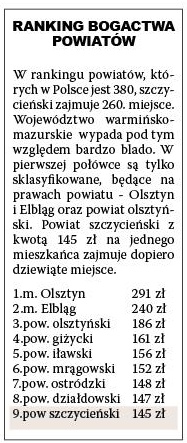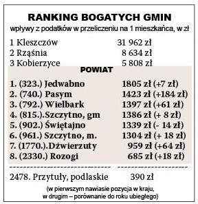 Największy awans w rankingu odnotowało miasto i gmina Pasym. Dochody z podatków w porównaniu do ubiegłego roku wzrosły tu o blisko 200 zł. – Trudno powiedzieć z czego to wynika – zastanawia się burmistrz Cezary Łachmański, choć nie ukrywa satysfakcji. Do tej pory w publikowanych rankingach kierowany przez niego samorząd zajmował końcowe miejsca. Tak było na przykład w zamieszczonym przez nas niedawno zestawieniu gmin pod względem nakładów na inwestycje. - Sytuacja nasza jest ustabilizowana, ale nie najweselsza – przyznaje burmistrz. Od przyszłego roku przez dziesięć kolejnych lat Pasym będzie musiał w swoim w budżecie rezerwować niemałe środki na wykup obligacji.
