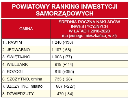 Gminy Pasym i Jedwabno wciąż przodują w powiecie pod względem środków przeznaczanych na inwestycje w przeliczeniu na jednego mieszkańca. W porównaniu do roku ubiegłego, te nakłady jednak spadły. Największy skok, niemal podwajając swój poprzedni wynik, odnotowały Rozogi. Swoją lokatę poprawiło się też miasto Szczytno, awansując z 14. na 12. w województwie.