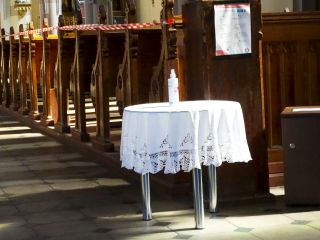Gdy wreszcie dostaliśmy się do sklepu, w kolejce do kasy pamiętaliśmy o obowiązkowych 2 metrach dystansu społecznego. Do lasu – można czy nie? Zdania na ten temat były podzielone, zmieniały się także zapisy w pospiesznie przygotowywanych przepisach. Na plac zabaw co najmniej na pewien czas wyjść z pewnością nie można było (fot. 3). Czy udanie się na cmentarz to realizacja bardzo ważnej potrzeby związanej z życiem religijnym? Takie pytania także się pojawiały, a odpowiedzi w różnych miastach bywały rozmaite. Życie religijne też uległo ograniczeniom. W kościołach pojawiły się pojemniki z płynami do dezynfekcji i taśmy zakazujące siadania w wyznaczonych ławach (fot. 4). Początkowo do świątyni mogło wejść 50 osób, potem liczbę tę ograniczono do zaledwie 5.{akeebasubs !*}