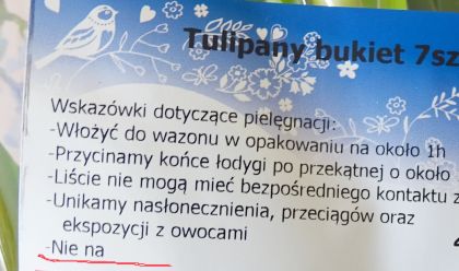 A propos życzeń kierowanych do płci pięknej – dołączane do nich są zazwyczaj kwiaty. Niżej podpisany kupował je ostatnio w większych ilościach i skorzystał w tym celu z oferty jednego z marketów. Można w nim było nabyć tulipany sprowadzone z ojczyzny tych kwiatów, czyli Holandii (czy, jak kto woli, Niderlandów). Z przetrzymaniem tulipanów do momentu wręczenia teoretycznie nawet i mężczyzna nie powinien mieć problemów, ale na wszelki wypadek zajrzeliśmy do dołączonych do bukietu wskazówek. W lekką konsternację wprawiła nas ostatnia linijka owej swoistej instrukcji (fot. 6). Mimo tego kategorycznego NIE zaryzykowaliśmy i kwiaty rozdaliśmy. Wierzymy głęboko, że żadnej z przedstawicielek płci pięknej nic złego się nie stało…