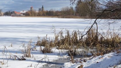 Zima co najmniej teoretycznie jeszcze trwa i mimo wiosennego od pewnego momentu klimatu w miniony weekend przypomniała o swoim istnieniu. Kierowcy musieli poświęcić w sobotę trochę czasu na poranne odśnieżenie pojazdów. Choć białego puchu spadło tak naprawdę niewiele, tu i ówdzie oczyszczono drogi i chodniki – nawet na cmentarzu (fot. 7), który wyglądał, jakby zima wcale jeszcze nie odeszła. Parę godzin później słońce zrobiło swoje, ale w wielu miejscach biel się utrzymała. Ciekawie prezentowała się ścieżka wokół większego ze szczycieńskich jezior. Na odcinkach miejskich trasy były zasadniczo suche, jednak na wysokości Kamionka czy Korpel śnieg leżał w najlepsze (fot. 8). Biała stała się w całości tafla naszego akwenu (fot. 9). Wprawdzie nie dostrzegliśmy nikogo łowiącego ryby na środku jeziora czy próbującego sobie robić sobie spacery po lodzie, ale w paru miejscach przy brzegu ślady wskazywały, że jacyś odważni ktosie sprawdzali wytrzymałość pokrywy. Wpadnięcie do jeziora dwa metry od brzegu utonięciem może nie grozi, ale tej formy zaspokajania swojej ciekawości nie polecamy.