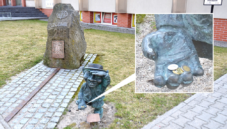Przy okazji jeszcze jedno – tuż przy kamieniu widzimy pofajdoka, który z powodu dłoni wyciągniętej jakby w proszącym geście, powszechnie uchodzi za żebraka. Nawet ten i ów lub owa ofiarują mu pieniążki (szczegół w otoku). Tymczasem nie jest to żaden żebrak, a Obieżyświat. W pustej obecnie dłoni trzymał ongiś busolę, czyli kompas. Niestety szybko został okradziony.