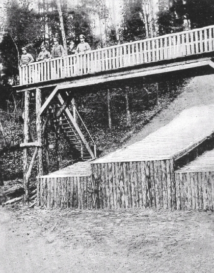 Już w latach 20. próbowano w Rudziskach skakać na nartach na prowizorycznie przygotowanej skoczni. Okazała się ona jednak niewystarczająca i w 1932 r wybudowano nowoczesny obiekt, wzorowany na alpejskiej skoczni w Bauer. Skocznia posiadała 3 tory. Krótsze służyły do nauki, środkowy i zarazem najdłuższy zwieńczony był wieżą. Skocznia nosiła nazwę: „Tannenberg”. Zbudowali ją żołnierze ze szczycieńskiej jednostki przy pomocy pionierów z Królewca pod kierunkiem sierżanta Williego Küssnera. Punkt krytyczny skoczni wynosił 30 m. W uroczystym otwarciu obiektu uczestniczyli skoczkowie z całej prowincji. Gwiazdą w trakcie otwarcia był słynny skoczek Hering ze Śląska.