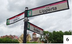 Wymiany tabliczek (ani wzbogacenia zestawu o np. partnerską serbską Batocinę) nie zauważyliśmy także w innym ważnym miejscu – przy wjeździe na plac Juranda. Mimo że maj zakończył się dwa tygodnie temu temu, wymiana wciąż trwa. Nowe tabliczki niemal bliźniaczo przypominają te, których design wyznaczono paręnaście lat wstecz: nazwa ulicy na białym tle, całość w kolorach miejskich plus herb Szczytna. Prace związane z wymianą miały postępować od obrzeży ku centrum, ale niektóre ulice z krańców Szczytna wymiany się nie doczekały. Zauważyliśmy ponadto, że przydałaby się wymiana ramek lub ich odmalowanie – są one w znacznym stopniu odrapane. Na skrzyżowaniach sąsiadują ze sobą czasami tabliczki z nazwami tej samej ulicy: jedna świeża (ale np. zgięta), druga – zabrudzona (fot.6).