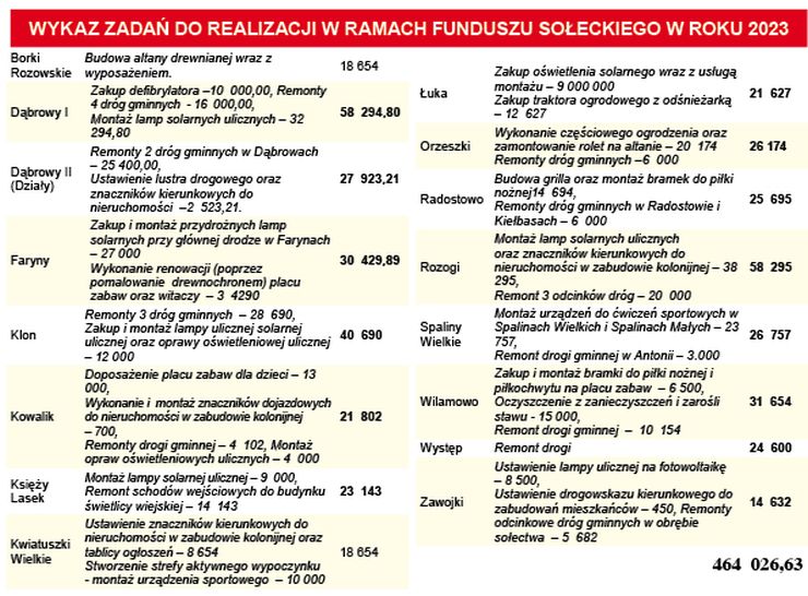 Już od siedmiu lat na terenie gminy Rozogi funkcjonuje fundusz sołecki. W tym roku na realizowane w jego ramach zadania zostanie przeznaczone 464 tys. zł. Najwięcej z tego sołectwa zamierzają wykorzystać na remonty dróg - 150 tys. zł oraz zakup i montaż lamp solarnych – 121 tys. zł. Chętnie też za pozyskane środki będą ogradzać, doposażać i remontować place zabaw – 48 tys. zł oraz montować urządzenia do ćwiczeń sportowych – 34 tys. zł. {akeebasubs !*}