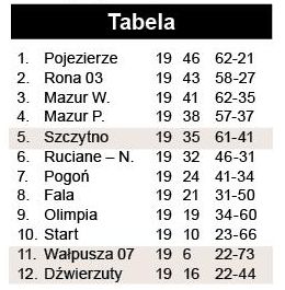 Lepsza gra w ostatnich meczach przyniosła wreszcie konkretne efekty. Podopieczni Cezarego Kucińskiego szybko wyszli na prowadzenie i… mecz pewnie wygrali. Przerwali w ten sposób fatalną serię – jedyne punkty w tym sezonie zdobyli tylko za walkower przyznany w nierozegranym meczu z wycofanym GKS-em Dźwierzuty. Trzy oczka miejsca w tabeli nie zmienią, ale wartość psychologiczna zwycięstwa – bezcenna.