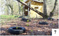 Dwa kilometry od zjazdu z drogi na Strugę mijamy stary cmentarzyk, opisywaną przez nas w poprzednim numerze kapliczkę i docieramy do wspomnianego wcześniej asfaltu. Jeśli skręcimy w prawo, dojedziemy do Wólki Szczycieńskiej, po skręcie w lewo znajdziemy się na przystanku kolejowym. Został on jakiś czas temu zmodernizowany. Co ciekawe, pozostawiono stojącą w głębi ciekawą, drewnianą wiatę (fot. 6), pamiętającą dawniejsze czasy, nie zdemontowano także płytek chodnikowych (trochę już zarośniętych) prowadzących do tej poczekalni. Swoistą romantyczność tej wiaty skrytej pod oryginalnie ukształtowanymi drzewami niszczą jednak dodatki, których nie widać może wyraźnie na wcześniejszym zdjęciu. Wnętrze poczekalni jest zaśmiecone, ściany są zapisane bazgrołami, a przed budyneczkiem (fot.7) i za nim (fot. 8) urządzono składowisko opon. Zaśmiecona jest także druga strona wytyczonej tu leśnej drogi. Klimacik wsi sielskiej, anielskiej pryska… Dodajmy, że przebiegająca tędy linia kolejowa ma znaczenie poniekąd międzynarodowe – prowadzi przecież do portu lotniczego w Szymanach. Osoby przylatujące na piękne Mazury zobaczą z okien szynobusu to i owo…