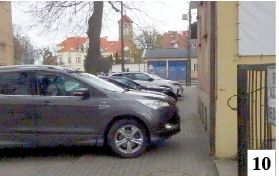 W minionym tygodniu prowadzono intensywne prace na placu pomiędzy ulicami: Ogrodową, Andersa i Lipperta. Wyrównano nawierzchnię usianą licznymi dołkami, nawieziono kruszywa. Przestrzeń od paru ładnych lat służy jako parking, a teraz ma służyć jeszcze lepiej w związku z ograniczeniem miejsc postojowych na placu Juranda. Nawierzchnia placyku faktycznie prezentuje się na razie korzystniej (sprawdzianem będą bardziej obfite opady deszczu), ale przestrzeń, mimo istnienia wjazdów i wyjazdów, oznakowana nie jest (fot.9) . To efekt tego, że zmotoryzowani parkują na terenie perspektywicznie inwestycyjnym – i nie ma tu raczej mowy o inwestycjach drogowych. W niedzielę, gdy robiliśmy owo zdjęcie, specjalnego tłoku na placu nie było. Zainteresowanie nim wzrasta w dni robocze. Niektórzy wolą jednak podjeżdżać tuż pod interesujące ich instytucje lub budynki. Tak jest np. na niedległej ul. Barczewskiego, gdzie nagminnie łamane są postojowe przepisy. Oto np. przykład kultury pewnego kierowcy, który swoim wozem wjechał niemal w ścianę obecnego biura poselskiego (fot.10) . Szczupła osoba jakoś się tędy przeciśnie, ale np. mama z wózkiem – już nie.