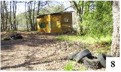 Dwa kilometry od zjazdu z drogi na Strugę mijamy stary cmentarzyk, opisywaną przez nas w poprzednim numerze kapliczkę i docieramy do wspomnianego wcześniej asfaltu. Jeśli skręcimy w prawo, dojedziemy do Wólki Szczycieńskiej, po skręcie w lewo znajdziemy się na przystanku kolejowym. Został on jakiś czas temu zmodernizowany. Co ciekawe, pozostawiono stojącą w głębi ciekawą, drewnianą wiatę (fot. 6), pamiętającą dawniejsze czasy, nie zdemontowano także płytek chodnikowych (trochę już zarośniętych) prowadzących do tej poczekalni. Swoistą romantyczność tej wiaty skrytej pod oryginalnie ukształtowanymi drzewami niszczą jednak dodatki, których nie widać może wyraźnie na wcześniejszym zdjęciu. Wnętrze poczekalni jest zaśmiecone, ściany są zapisane bazgrołami, a przed budyneczkiem (fot.7) i za nim (fot. 8) urządzono składowisko opon. Zaśmiecona jest także druga strona wytyczonej tu leśnej drogi. Klimacik wsi sielskiej, anielskiej pryska… Dodajmy, że przebiegająca tędy linia kolejowa ma znaczenie poniekąd międzynarodowe – prowadzi przecież do portu lotniczego w Szymanach. Osoby przylatujące na piękne Mazury zobaczą z okien szynobusu to i owo…